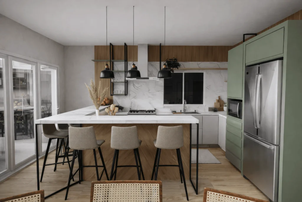 Neste projeto, uma bancada em mármore branco transforma a dinâmica do lar. Esse elemento central serve como ponto de encontro para refeições rápidas. Além disso, o equilíbrio visual é fundamental para um ambiente moderno. Por exemplo, a marcenaria em tons de verde oliva traz um contraste orgânico. De fato, quando combinada com painéis amadeirados, ela cria um espaço muito acolhedor.